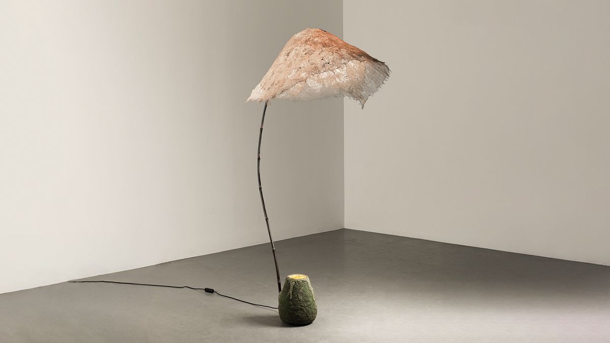 Ishigaki Floor Lamp #24 by Paris-based design practice Aki+Arnaud Cooren is a work rooted in lived experience and material exploration. The lamp draws inspiration from experiences of freediving off the coast of Ishigaki Island in southern Japan, where immersion in the marine environment informed both the piece’s tactile surface and moss sand colour palette. The lamp’s textured base and shade evoke mineral deposits, coral formations, and underwater topographies, while the light projected overhead by the lamp is reminiscent a spot of sunlight on the sea’s surface as viewed from underwater.