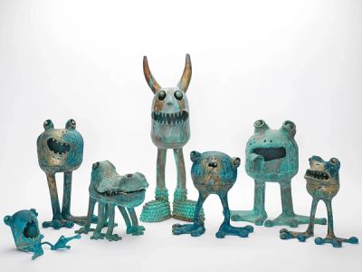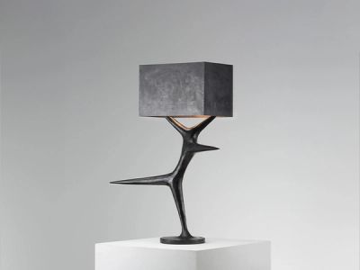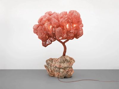 Examining a different temporal perspective, Nacho Carbonell’s artistic practice looks to the future. His sculptures mirror the inner vitality of Baas’ personified clocks, but express themselves through a natural language, imbuing raw urban materials with an organic sensuality. The series of light sculptures throughout the booth, including One-Seater Concrete Tree and Growing Glass 2 and Stone Table Lamp demonstrate Carbonell’s unique approach to materiality, with each piece illuminated from within shades of metal mesh, recycled glass, and concrete rubble.