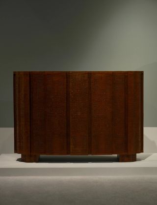 Ingrid Donat is one of the most influential living artists in the decorative arts. Her work Buffet Facettes is a bronze cabinet that reflects the artist's skill for integrating sculptural practice into functional pieces of art. The repetitive, mathematical pattern on the surface of the work is achieved through a precise process of wax casting, imbuing the work with meaning and symbolism. Commode Ooni, one of Ingrid Donat's masterpiece works, exemplifies her profound understanding of form, texture and craftsmanship. The commode is a triumphant return to her signature aesthetic of linear scarification, a technique she has refined over the years to create intricate patterns that adorn the bronze surfaces of her creations.