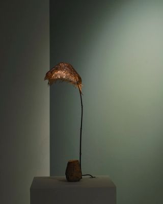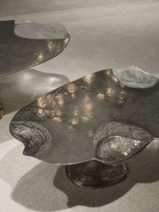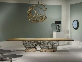 Spanish designer Nacho Carbonell creates functional artworks whose scale and organic nature are inspired by the ecological landscape of Valencia from the artist’s childhood, where the land saturated with sunlight results in a specific type of vegetation. Sculpted with plaster and black sand applied onto a metal mesh structure, Earth Clod Armchair 2 reflects the artist’s fascination with texture, demanding to be explored up-close. The new Getty Table continues Carbonell’s exploration of organic form and hybrid materials but through a distinct structural approach, with a sprawling metal structure emerging from two solid, jagged bases resembling rocky landforms.