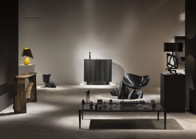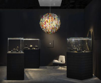 Other highlights include a new unique console from Vincenzo de Cotiis’ latest collection Interlude, as well as Andrea Branzi’s monochrome, minimalist cabinet, Stone 2A. Two large light sculptures from Nacho Carbonell and Stuart Haygarth are also exhibited, filling their environments with light and colour.