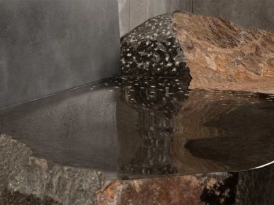 Raw volcanic stone is paired with precision-cut steel, the two materials existing side by side without compromise. The stone is often left untouched or cut to reveal its hidden textures, while the steel provides clean, linear counterpoints. Park resists forcing one material to adapt to the other, instead allowing tension and harmony to emerge from their coexistence.
