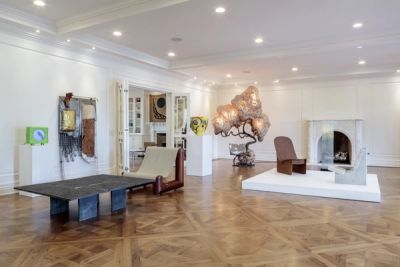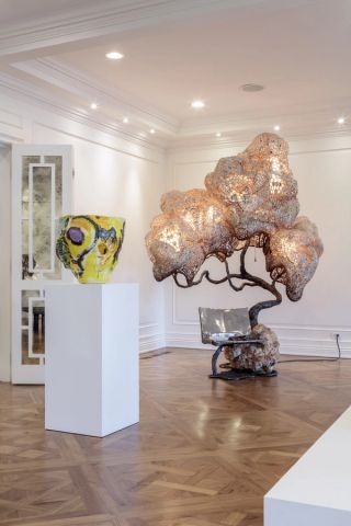 Carbonell’s Custom Trono (2023) – which is part of his series of sculptural lamps – exemplifies the booth’s theme and is a key highlight of the fair, depicting his tactile approach and ethos for viewing objects as living organisms. Crafted by hand, Carbonell toys with texture, techniques and natural materials to give each of his artworks different personalities. The Custom Trono, a sculptural marvel that stands like a tree made of honeycomb, features soft, gentle light exuding through its mesh cocoons and a metal seat carved into the base. Also exhibiting is Atelier Van Lieshout’s New Family Lamp (2020), a continuation of his series of humanoid lamps exploring personal relationships, in which the artist exhibits a modern take on fertility, birth and life. For this piece, three family members are arranged close to the overhead canopy, with themes of stability and institution reinforced through Corten steel.