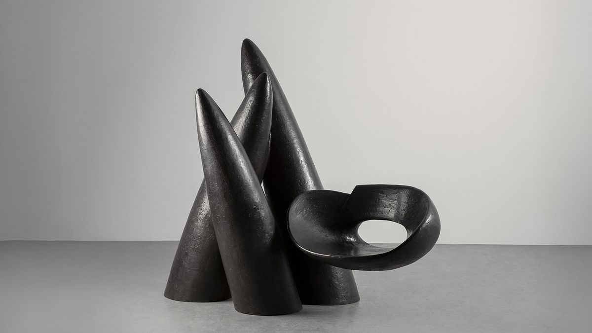 Revered as the founding father of the American art furniture movement, Wendell Castle was a pivotal figure in redefining the boundaries between art and design in the late 20th century. Veiled in a Dream, features three tapering, conical spires providing the framework for the seat suspended from their side. First carved from wood and then cast in bronze, the work’s aerodynamic form appears to defy the logic of its material.