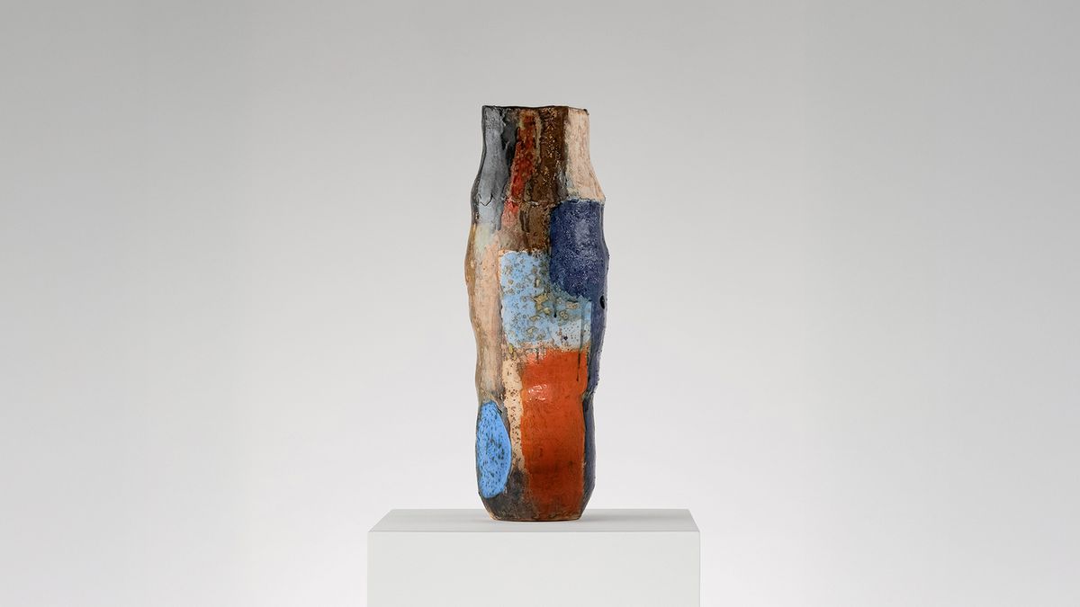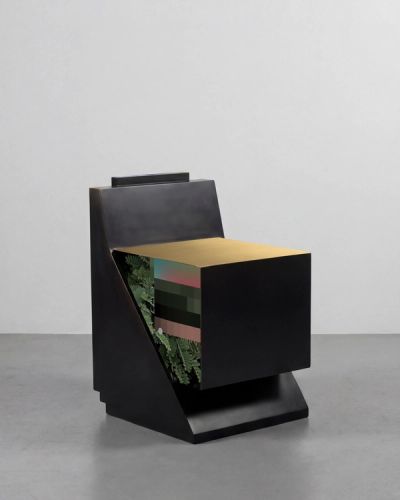 The Brazil-based Campana Brothers are known for their curiosity for mundane, everyday materials and their unique way of representing the world. Sculpted from reused fabric, rubber and metal, Sushi Cabinet Steel reflects the studio’s investigations into upholstery and experimentations with discarded cloth and carpet. Swirling circular patterns in vivid shades of green and blue are found in the fabric panels of this work.