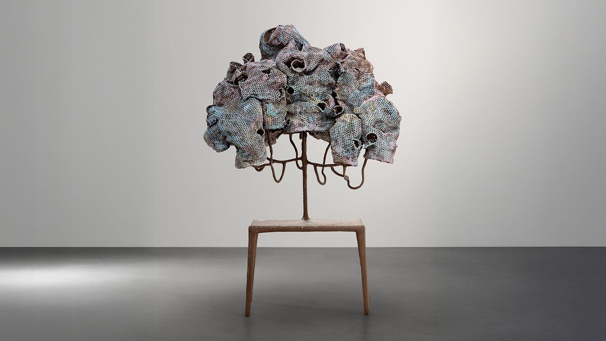 Spanish artist Nacho Carbonell views objects as living organisms whose design and materiality come to life in the viewer's imagination. His Table Cocoon 6 is a sculptural lamp positioned on a table structure and swathed in metal mesh and plaster. Pigmented in a shade of brown, the monochromatic sculpture typifies Carbonell’s tactile approach to sculpture and his interest in texture and experimental techniques.