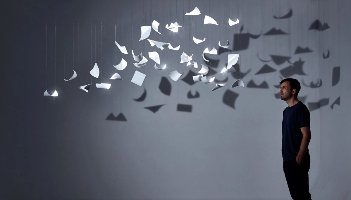 Also featured is Paul Cocksedge’s highly original light sculpture, Light and Shade, composed of LED sheets suspended in mid-air. Its composition suggests the sheets are being whipped away in the wind, but Cocksedge finds an eerie stillness within its illuminations, as if having stopped time itself.