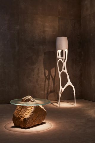 Australian artist Charles Trevelyan includes his new Supine III, a bronze desk finished in a minutely detailed patina. The artwork’s network of supporting legs proliferate in unexpected directions, inspired by the randomness of the natural world.