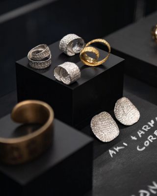 Walid Akkad’s Bull Ring leads his series of pure 18k gold rings styled as minimalist animal silhouettes, alongside Alice Cicolini’s Candy Ring, which is able to be stacked in different layers, variating the gold, enamel, and diamond patterns.