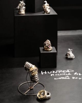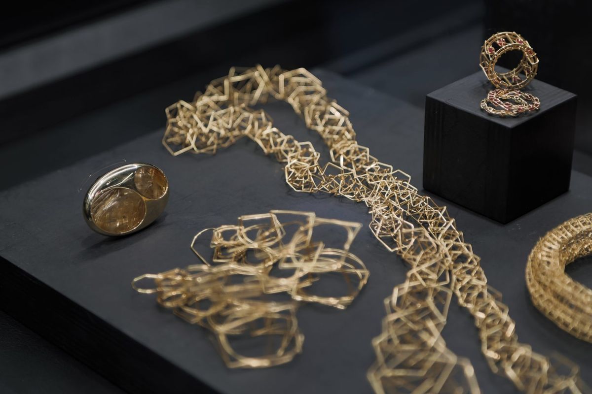 Also exhibited is a collaboration between multidisciplinary artist Rashid Johnson and LIZWORKS. Creating the Anxious Men collection allowed Johnson a physical means of negotiating with his own fears, finding catharsis in the wearable titanium and gold artworks interspersed with single rubies.