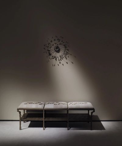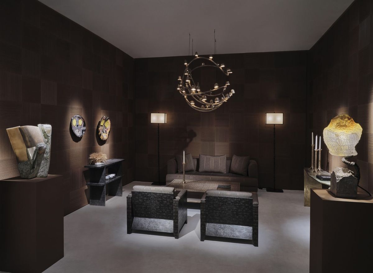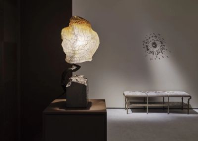 Donat has invited a careful grouping of creative collaborators to add to the presentation by choosing pieces from Vincenzo de Cotiis’ En Plein Air series emphasizing a playful use of light and shadow through his use of materials like semiprecious stones, Murano glass, recycled resin, and cast brass. In contrast, Roger Herman’s ceramic artworks highlight the German artist’s mastery of color and texture, with bold and expressive pieces that challenge traditional forms. Nacho Carbonell and Frederik Molenschot’s captivating light sculptures, which dynamically explore the interplay between light and material. Finally, Najla El Zein’s seminal work Hay invites the viewer to engage with the immersive experience of an otherworldly landscape. Together, these diverse artists offer a unique exploration of the creative potential of materiality and craftsmanship in contemporary art.