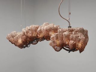 Nacho Carbonell’s Long Cocoon Chandelier (230/2023) (2022) features sinuous branches that spawn into a luminescent forest. Swathed in metal mesh with Paverpol and Pigments, the piece typifies Carbonell’s tactile approach to sculpture, and his penchant for playing with texture and experimental techniques. The artist views objects as living organisms, whose design and materiality come to life and spark imagination in the viewer.