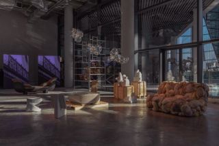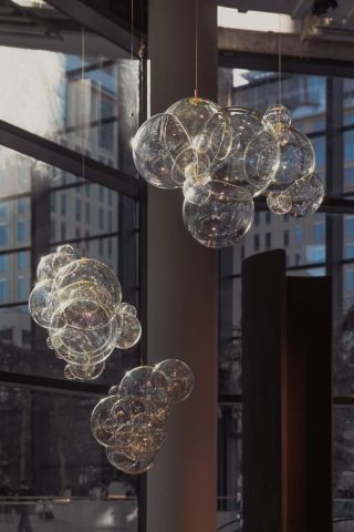 David/Nicolas pushes the malleability of stone and glass to new extremes with bending waves and organic shapes that surprise and confound but are rooted in the natural beauty of the material. Floating bubbles fixed overhead in glass sculptures from the Verhoeven Twins inform us of the space around us, creating valleys and voids that allow us to explore the shape and light through their delicate intricacy.