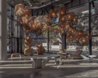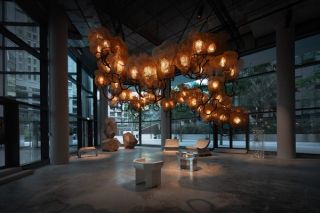 The polarities of the exhibition are summed up through two contrasting works by Nacho Carbonell. Bathed in light, the polychromatic canopy of Combi Cocoon 2 shines with a warmth that’s reminiscent of the Spanish artist’s sun-baked homeland, while the brooding glow of the lights that punctuate the voluminous black shades of Inside a Forest Cloud represent constellations in a pitch-black sky.