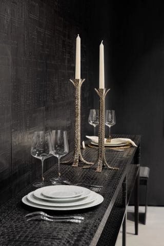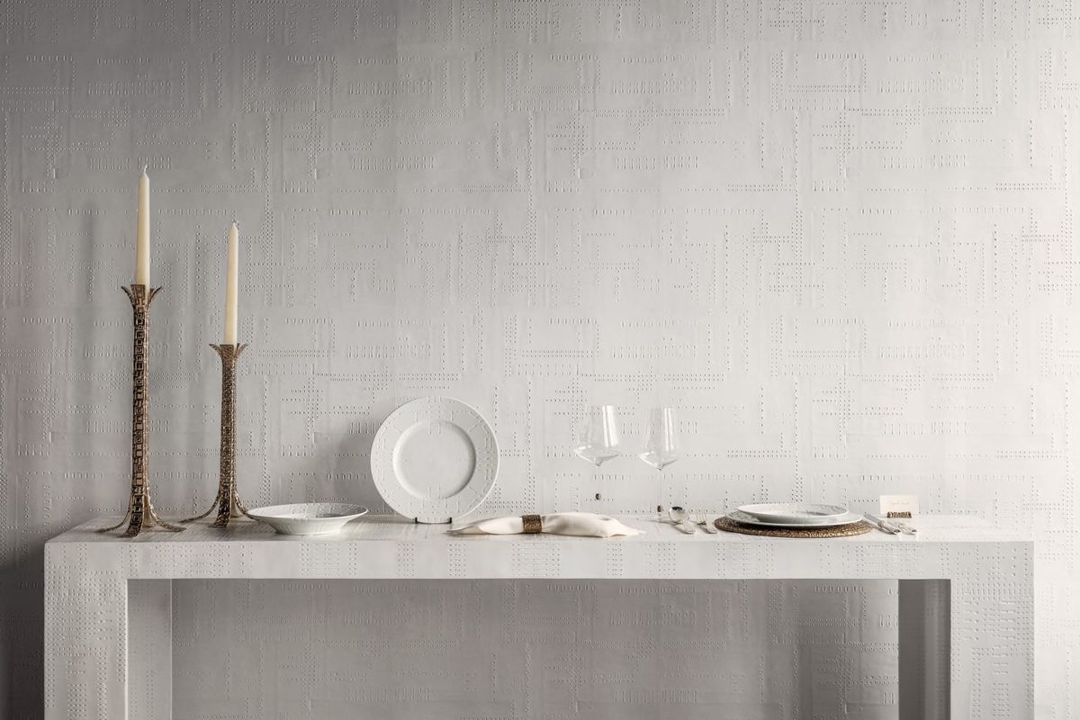 The Maya service, made by Ginori 1735 in ivory-white porcelain, comprises five sizes of sculpted plateware – flat, soup, dessert and bread – with tactile and vibrant surfaces that portray the depth of the artist’s vision through the engraved markings. Around these elements, a complete and harmonious table takes shape with crystal wine glasses, polished silver cutlery and bronze accessories of napkin rings, place cards, leather underplates and candle holders also designed by Donat. Bearing finishes ranging from polished to glazed, the designs weave a convivial atmosphere that engages all senses.