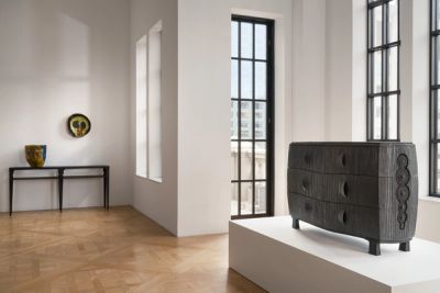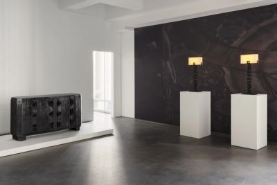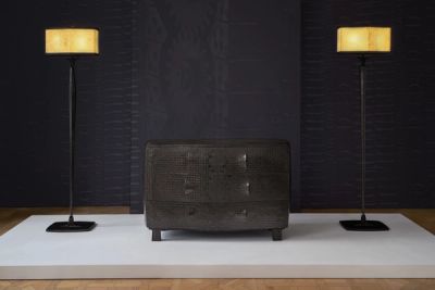 Two other new works are shown in this exhibition for the first time. Commode Maya features a bronze exterior marked with an experimental, mechanical pattern that resembles animal- or insect-like forms inspired by the art of the ancient Mayans. The handles have been hand-molded by the artist out of wax, leaving her personal, physical imprint on the work. Commode Tatoo features square, geometric patterns resembling reptilian skin, like that of a crocodile or even a mythical dragon. Its rounded edges create feminine curves that make the piece appear as if it is breathing.