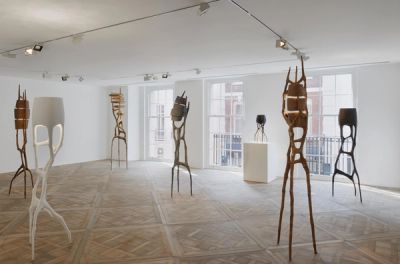 The collection of just taller than human-sized lamps feature bronze and patinated bronze pieces, allowing the light to play off of the surface’s different finishes, giving an individual voice to each piece. The works’ tribal or supernatural-like qualities are impossible to define, existing only in the imagination of the artist.