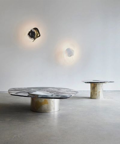 In the series, De Cotiis emphasizes decoration vis-à-vis an architectural sensibility, creating a contemporary twist of shapes and functions by pairing precious noble materials - silvered castbrass, French marble, Murano glass - steeped in rich artistic heritage with unexpected contemporary materials such as fiberglass.
