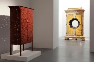 The armoire, a vertical storage unit: the Dutch designer Maarten Baas envisioned the ‘Carapace Cupboard’ (2016) a shell crimped with plates of welded steel scales, Vincent Dubourg underlines the emptiness and the deconstruction for his ‘Armoire Chinoise’ (2012) in aluminium, and the Dutch design duo Studio Job play with a metaphor that expresses the ravage of 19th century industrial society, with the ‘Robber Baron Cabinet’ (2013).