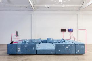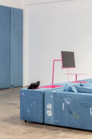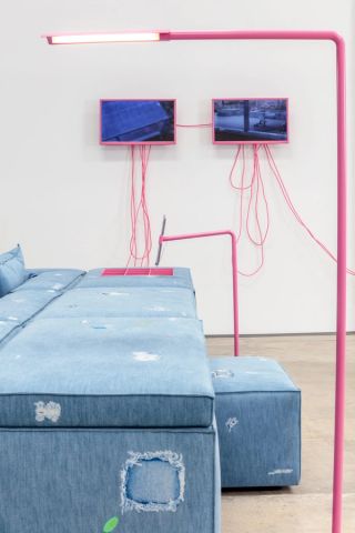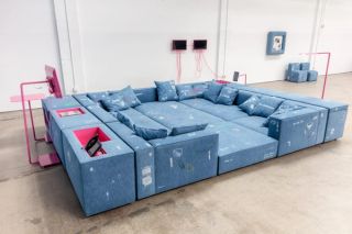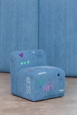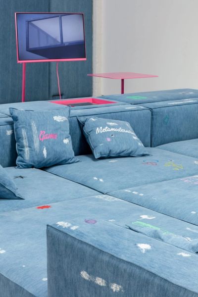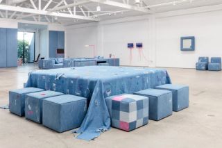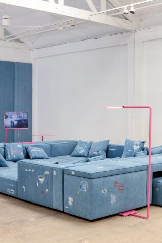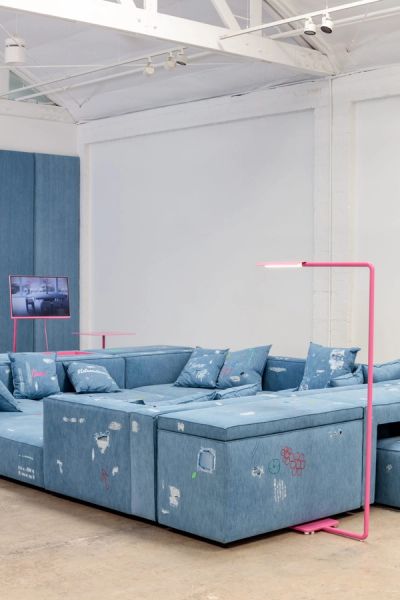 Harry Nuriev’s Denim House presents a total environment that merges a luxurious lifestyle with function and expression. Denim House realises Nuriev’s dreams of an idealised family room, set within the domestic culture the artist sees as particular to Los Angeles. Following his previous show Denim, he has dived deeper into the nuances of denim as a statement material and has embellished the artworks for this exhibition with hand-embroidered writing, additional stickers, and extra furnishings such as the new dining tablecloth. The artist is a pioneer of transformism, a manifesto that overlaps aspects of fashion, art and architecture simultaneously. Through this collection, Nuriev intends to enable the same levels of personal expression as seen in street fashion within a home environment.