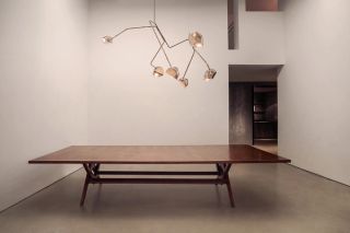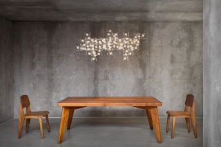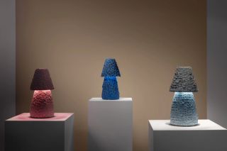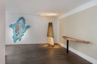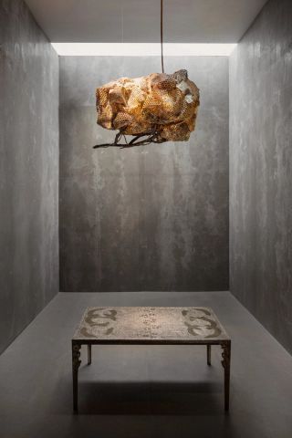 The first floor brings together the work of the Campana Brothers and Nacho Carbonell, highlighting the organic and playful sensibilities that define both practices. The Campana Brothers’ approach often transforms everyday or humble materials into exuberant compositions that blur the boundary between furniture and sculpture, exemplified by Sushi Mirror Wall 1, a reflective installation that expands and distorts spatial perception. Carbonell’s works appear almost organism-like, expanding into space through layered textures and irregular forms, as seen in the Small Blue Twin Chandeliers, which suspends Carbonell’s signature metal mesh into delicate forms, reminiscent of Carbonell’s sculptural approach. Within the gallery setting, their works establish a dynamic environment in which collectible design becomes animated, expressive and open-ended.