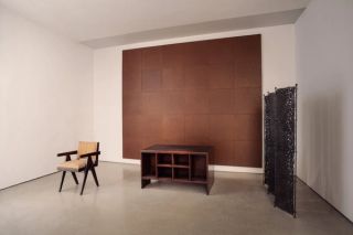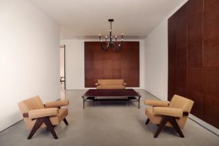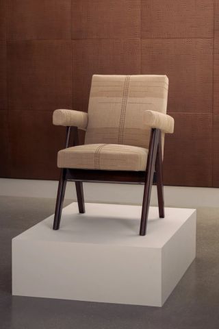 On the ground floor, the exhibition places the work of Ingrid Donat in dialogue with that of Pierre Jeanneret. Known for her sculptural bronze surfaces and richly symbolic motifs, Donat engages directly with Jeanneret’s modernist furniture, reinterpreting several historical pieces through subtle yet meaningful interventions. Donat and Jeanneret’s practices enter a tangible dialogue, where contemporary craftsmanship meets modernist design history, through Donat’s additions to some of Jeanneret’s iconic designs. Two Committee Chairs and a Lounge Set originally designed by Jeanneret have been reupholstered by the artist, introducing a renewed tactile and visual presence while maintaining the architectural clarity of the original forms. Donat has also reworked a Jeanneret Desk, adding a leather padding that features her signature patterned motifs. These gestures establish a layered conversation across time, where Jeanneret’s historical designs encounter Donat’s expressive ornamental language. This encounter underscores how historical design can be reactivated through contemporary interpretation, revealing the continued relevance and adaptability of Jeanneret’s forms within a new artistic language.
