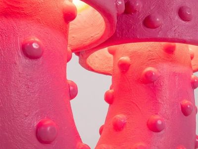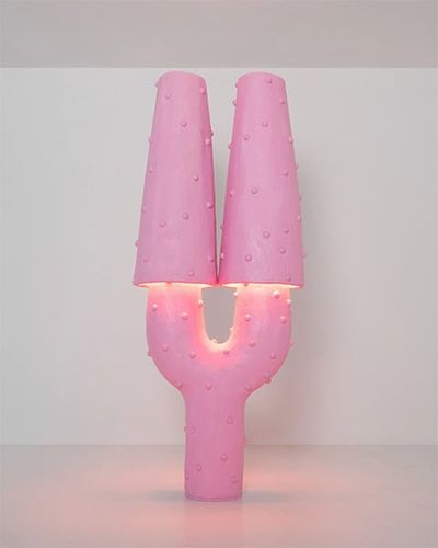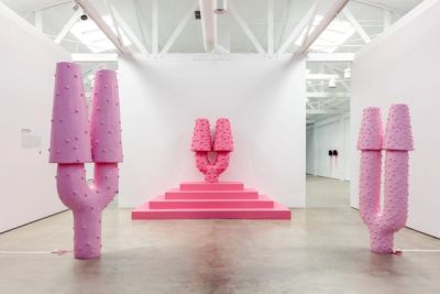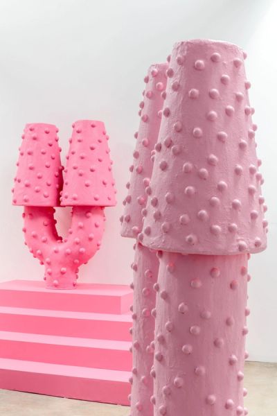 To stand among Léa Mestres’ outsized sculptures is to journey through the looking glass and enter a world of the French artist’s colourful imagination. Her show Family Business is reminiscent of Carsten Holler’s rooms filled with giant mushrooms, or Nikki de Saint Phalle’s iconic Tarot Garden in Italy. Mestres draws from a wide range of popular culture, from the absolute pink of fashion designer Valentino to rapper Missy Elliot’s music videos, condensing this vivid imagery into the textured columns of her sculptures which also reference crépi, a rough concrete plaster ubiquitous across France and Europe. Highly research-driven, Mestres counters notions of ‘feminine art’, ignoring expectations, re-appropriating stereotypes and prioritising joy in her work at all costs. Named after friends of hers, Mestres’ three towering artworks Stacy, Suzy and Jessy are all personified as larger-than-life characters.