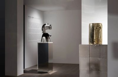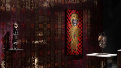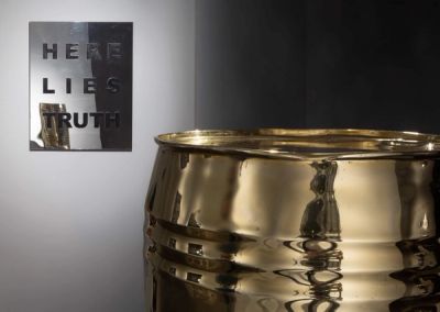 On a support-mirror, an immense bronze sculpture: a woman without hands, whose forms echo the fabulous idea of an ancient African statuary that remains undefined. She is surrounded by eight bronze masks, placed on a support that reflects them one after the other. On the walls, a colored wallpaper, red - believe / lie. A text as a reflection. The device is posed without detour: lie, believe - the lie become the transparent measure of our beliefs.