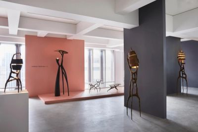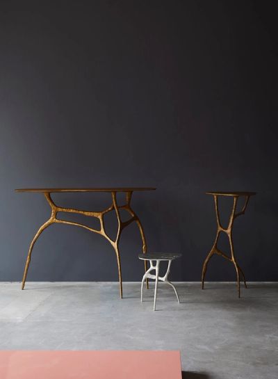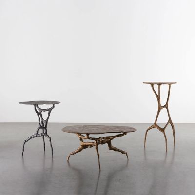Other works on view, a series of side tables, human size floor lamps, and desks are executed in bronze with various patina technique and new finishes in white gold, which give them a muted wildness. Each piece boasts bold, elongated forms and expressive lines, reminiscent of trees and roots.