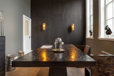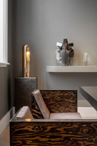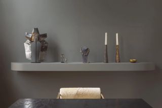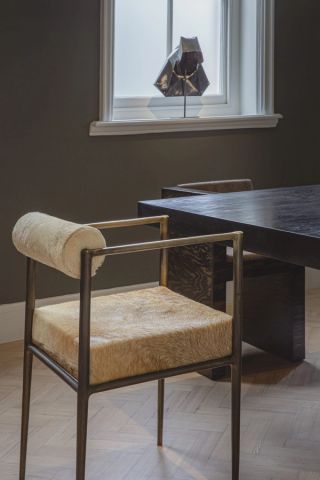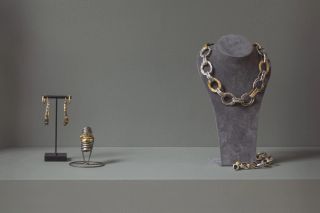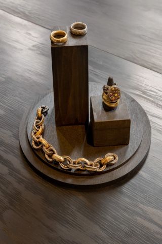 The jewellery is complemented by the Rick Owens’ design pieces, an expression of his signature style of glamour with a provocative edge. The Plug Table Black Plywood (2011) channels Owens’ minimal aesthetic with its geometric shapes, clean lines and monochrome palette. Hustool Gold (2022), formulated from bronze patinated in polished gold, pays homage to Michèle Lamy with the title affectionately referring to her nickname ‘Hun.’ Other works on display include Large Plate (2016), constructed from bronze with an elegant and simplistic form; Bowl, which features a round shape, small triangle detail and polished surface; and the Candle Pillar (2007), a brutalist column that would make the ideal accompaniment to the dining table experience.