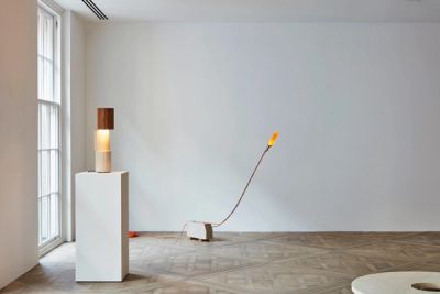 The relationship between materials is a main feature of Laforêt’s work. In his oak and concrete monumental lamps and coffee table, the two materials react with each other to give them their unique character and colour.