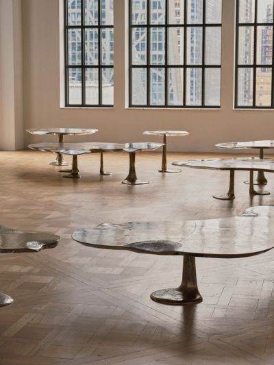 With the opening of Je Marchais Pieds Nus Dans L’Étang in New York, De Cotiis continues his exploration of material transformation, creating an environment where sculpture, light and memory converge. The installation exists in a state of flux, where forms emerge and dissolve, shifting perception with each movement through space. A specially curated soundtrack complements the exhibition’s serene ambiance.
