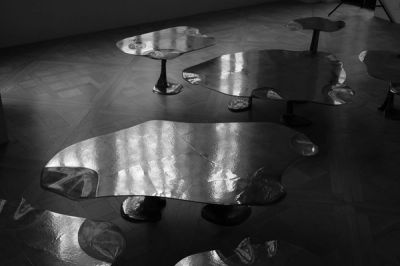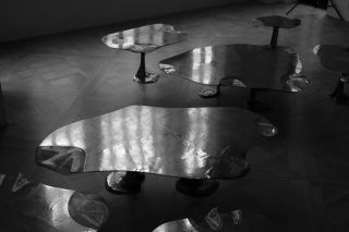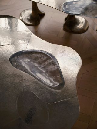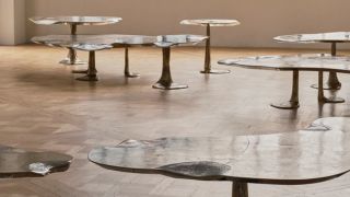 Je Marchais Pieds Nus Dans L’Étang (meaning ‘I Walked Barefoot in the Pond’) reinterprets the pond as a sculptural environment, where organic forms, shifting reflections and enigmatic creatures emerge within a dynamic spatial composition. A collection of individual unique works of art come together as a singular cohesive installation, where each sculptural element contributes to a fluid, immersive experience, evoking the sensation of wading barefoot through an imagined landscape.