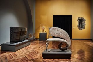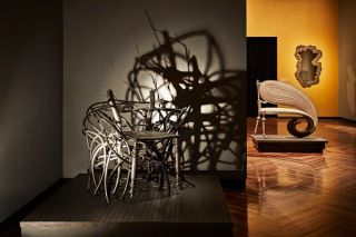 The thirty-three works that make up the exhibition represent the most recent manifestations of contemporary design from national and international artists. Works range from pieces by Alexander McQueen and Junya Watanabe, whose collections frequently reference baroque aesthetics, to the architectural volumes of Zaha Hadid and Frank Gehry; likewise, Nacho Carbonell’s play with textures and organic forms is juxtaposed against the experimental furniture and implausible lamps created by the Dutch workshops Studio Job and Studio Drift.