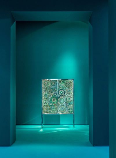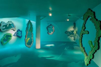 Humberto adds: « The inspiration comes from the SUSHI series that includes chairs, sofas, buffets and other objects. We decided to frame mirrors with felt, rubber carpet and EVA in different shades of green, blue and white to create a liquid atmosphere - hence the name of the exhibition. The mirrors connect to water, and we added curved lines (not unlike the shape of sushi rolls) to the frames to create different patterns of colors. Our work is handmade and hence very precious. We try to introduce humanization to the process of manufacturing, which is a key aspect of Brazilian design »