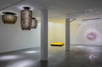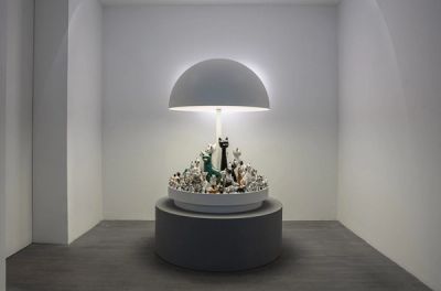His process follows a precise methodology. He collects, and then classifies the pieces of a huge 3D puzzle based on choice and assembly. Whether the material is kitsch items or perished plastics, it takes on the form of a repertoire organised according to two categories: colour and function. His interest in neglected and found objects is justified by his urge to give them a new life, a new story. This hybrid and transformative thinking, allied with light, paradoxically causes the banal to metamorphose into extraordinary and precious chandeliers, furniture and installations.