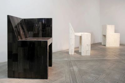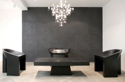 Through his choice of subtle and rare materials, Rick Owens suggests the beauty of original nature and develops a contrasting palette of black and white that confirms the designer’s taste for the monochrome. The 500,000 year old fossilized wood throws up subtle nuances of smoked brown and the blackened plywood provides a counterpoint to the lighter tones; alabaster, a sublime material used by sculptors in Sumerian times whose transparent pallor echoes the color of the ivory of a cow’s bone. Dealt with in juxtaposition, the values come together and compose a three-dimensional piece that is totally relevant to the designer’s own style. He cuts and shapes a transversal and global universe, from fashion to furniture.