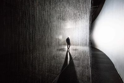 Rain Room is a field of falling water throught which it is possible to walk, trusting that a path can be navigated, without being drenched in the process. As you progress through exhibition room, the sound of water and a suggestion of moisture fill the air, before you are confronted by this carefully choreographed downpour that responds to your movements and presence.