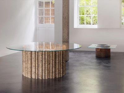 The same gestural sensitivity combines with a strong conceptual awareness in later works like Excavation Sliced Core Table, which Cocksedge created in 2017 after hearing he was to be evicted from his London studio to make way for luxury flats. He extracted hundreds of cylinders from the studio’s floor, pairing the coarse textures of these brick and concrete pieces with the lightness of glass tabletops. The works highlight the transient and precarious experiences of creative professionals in major cities like London as they seek places to live and work.