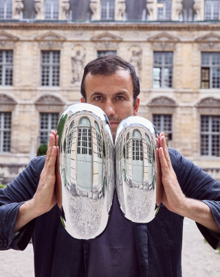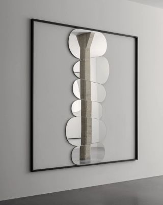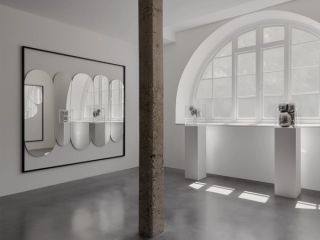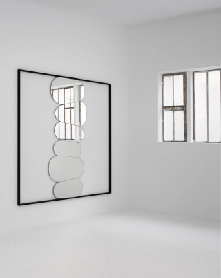 In more recent years, Cocksedge has further developed his fascination with creating reflective surfaces, which he views as a form of alchemy – a combination of liquids that form a perfect mirror layer. In the Squeeze series, Cocksedge first compresses three-dimensional soft circular forms, before reinterpreting them into two-dimensional mirrors. This transforms the essence of the soft forms into flat, reflective surfaces, creating a sense of movement. Begun in 2024, this series made Cocksedge think of early human encounters with reflection, as seen in water or metal surfaces. “There’s an intimacy in the way these forms come together,” says Cocksedge. “I see them almost like a parent and child—soft, protective, and connected. That warmth and closeness are just as important as the materials themselves.”