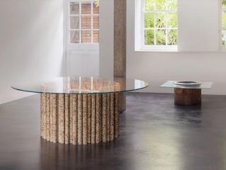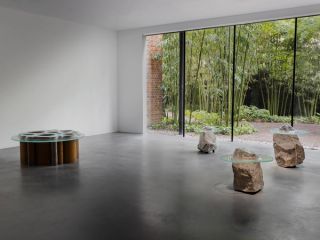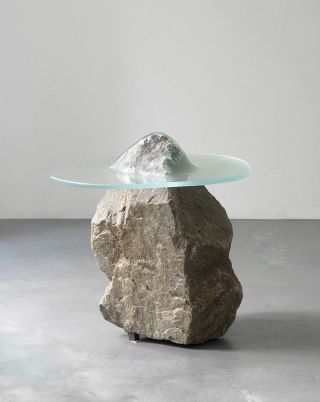 Completing the display are 2025 pieces adding to the Slump series, which originated in Cocksedge's long-standing fascination with industrially produced materials, having visited hundreds of factories over the course of his career. The designer shapes glass around concrete, steel, wood and rock to form ethereal tabletops, stretching and reworking the glass sheets at extreme temperatures to give the rigid, flat material an unexpected softness and fluidity. The steel base below the glass tabletop in the Slump Bubble Table gives the impression of being under a watery surface, while the stone and iridescent glass of the three new Slump Rock Drop Coffee Tables resemble a river running over a bolder.