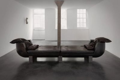 The dialogue between permanence and impermanence deepens in Double Bubble (2025), where rusted steel and graphite crocodile leather engage in a tactile conversation between the elemental and the animal. Similarly, the monumental K Plug Table (2022) revisits a form first prototyped by Lamy from Owens’ sketches — a continuous study in balance and bronze. Finally, Pedalò Rust (2025), with its distinctive steel patina and camel leather cushions, captures the exhibition’s pulse: each rust pattern a record of time’s passage, every surface a map of transformation.