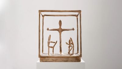 Burger of Calais II is the atelier’s interpretation of Auguste Rodin’s The Burghers of Calais (1889), which captured the despair and courage of the citizens of Calais in the face of death. Joep van Lieshout has sculpted these burghers to consider contemporary ideas of heroism and honour of those willing to sacrifice themselves for their ideals. The artist’s dialogue with sacrifice is continues through Backpack, a love letter to the felled fighters who rest in the Champs-Élysées, the final resting place of warriors in Greek mythology. The backpack viewed as a warrior’s essential arsenal, the ultimate survival kit and a necessity for going rogue to win wars or start a new life. Surrender is reflected by The Caretakers and Maria’s Cloak, not as defeat but as a gesture of care, devotion and remembrance.