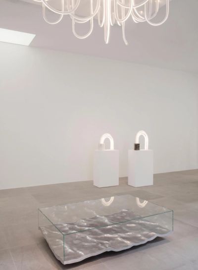 The ‘Liquid Aluminium’ and ‘Liquid Marble’ tables were designed, for example, using 3D special effects software created for the film industry and the designer sought advice from laboratory equipment manufacturing experts in order to bend the curved glass tubes of ‘Les Cordes’.