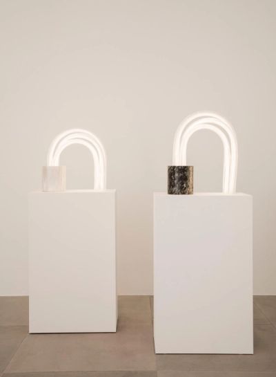 The works in the ‘Spring’ exhibition seem to hesitate between solid, liquid and gaseous. They appear to be suspended mid-transformation in a poetic state of metamorphosis. Marble and aluminium become liquid, onyx becomes air and glass softens as in a return to its original state.