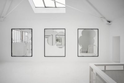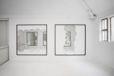 As a starting point for these works, Cocksedge compresses three-dimensional soft circular forms. These shapes are then reinterpreted into two-dimensional mirrors, transforming the essence of the soft forms into flat, reflective surfaces, creating a sense of movement. The work’s frames serve as structures that hold these forms in place.