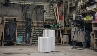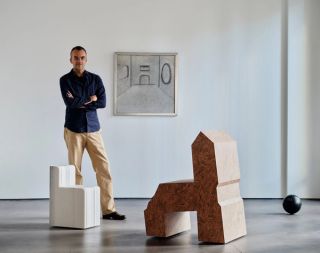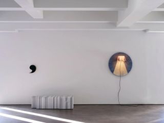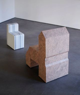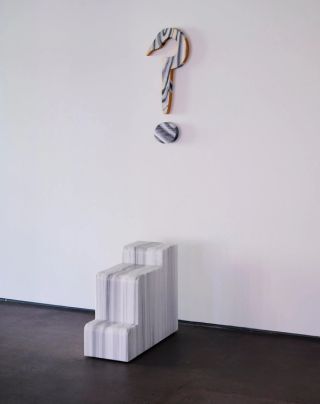 Stadler ‘s works echo his predecessor’s innovative manipulation of surface and substance. 3DPD (2022)—the series’ title alludes to traditional pietre dure—is waterjet cut from a spectacular decorative marble called Striato Olimpico. This material is typically used as a veneer, but Stadler intentionally exposes its “wrong” faces—the mineral equivalent of a broadcast breaking down into white noise. Return of the Thing (2021) appears to be carved from wood but is actually made using hydrographic printing; Fantom Light (2022) features real stone inlay alongside a textile digitally printed with a faux marble pattern, echoing Artschwager’s frequent use of Formica. As Stadler puts it, “Today, thanks to the multitude of available production technologies, objects can take on any shape and any appearance. The real and the fake, the natural and the artificial, blend into each other in a previously uninhibited way.”