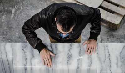 Stadler ‘s works echo his predecessor’s innovative manipulation of surface and substance. 3DPD (2022)—the series’ title alludes to traditional pietre dure—is waterjet cut from a spectacular decorative marble called Striato Olimpico. This material is typically used as a veneer, but Stadler intentionally exposes its “wrong” faces—the mineral equivalent of a broadcast breaking down into white noise. Return of the Thing (2021) appears to be carved from wood but is actually made using hydrographic printing; Fantom Light (2022) features real stone inlay alongside a textile digitally printed with a faux marble pattern, echoing Artschwager’s frequent use of Formica. As Stadler puts it, “Today, thanks to the multitude of available production technologies, objects can take on any shape and any appearance. The real and the fake, the natural and the artificial, blend into each other in a previously uninhibited way.”