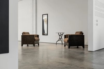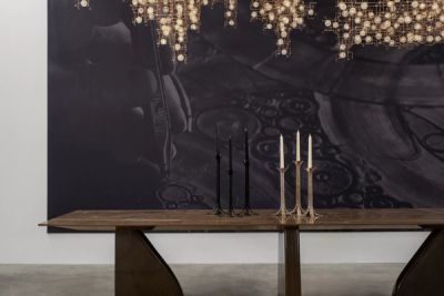 Another upholstered piece, Fauteuil Kapon, features a plush, satin seat whose golden-green colour subtly echoes the bronze finish of the sculpted base supporting it. Juxtaposing fabric and metal, the work forms a meeting point for two opposing yet complementary materials, with each enhancing the patterns and texture of the other. The armchair is proportioned to seem weighty and voluminous but without dominating its environment, illustrating the consideration of space and form that drives Donat’s rigor in designing artworks and interiors.
