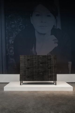Over the years, Donat’s work has come to be synonymous with the commode – an item with which she has a long-term affinity, and which features the signature aesthetic of mark-making and scarification that permeates her practice. The square, geometric patterns on Commode Tatoo resemble reptilian skin, like that of a crocodile or even a mythical dragon. Exuding an anthropomorphic quality, the rounded edges of the work create feminine curves that make the piece appear as if it is breathing or in gestation.